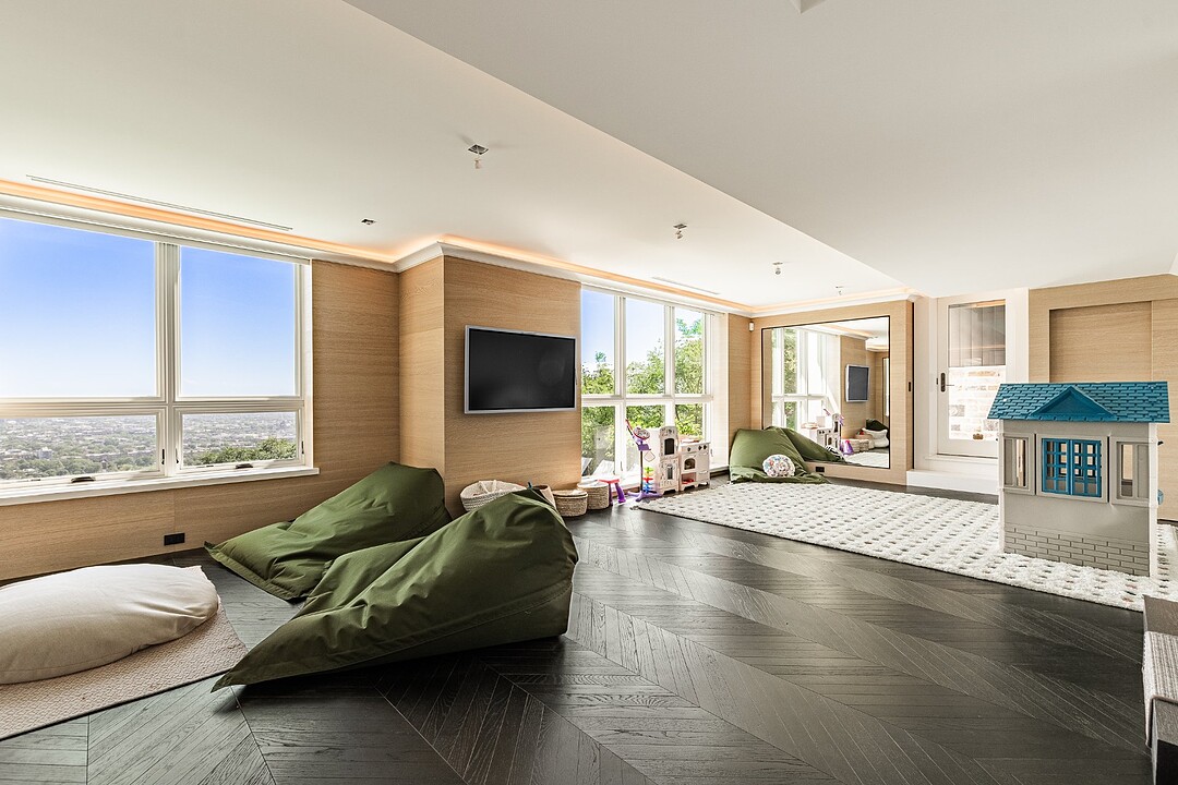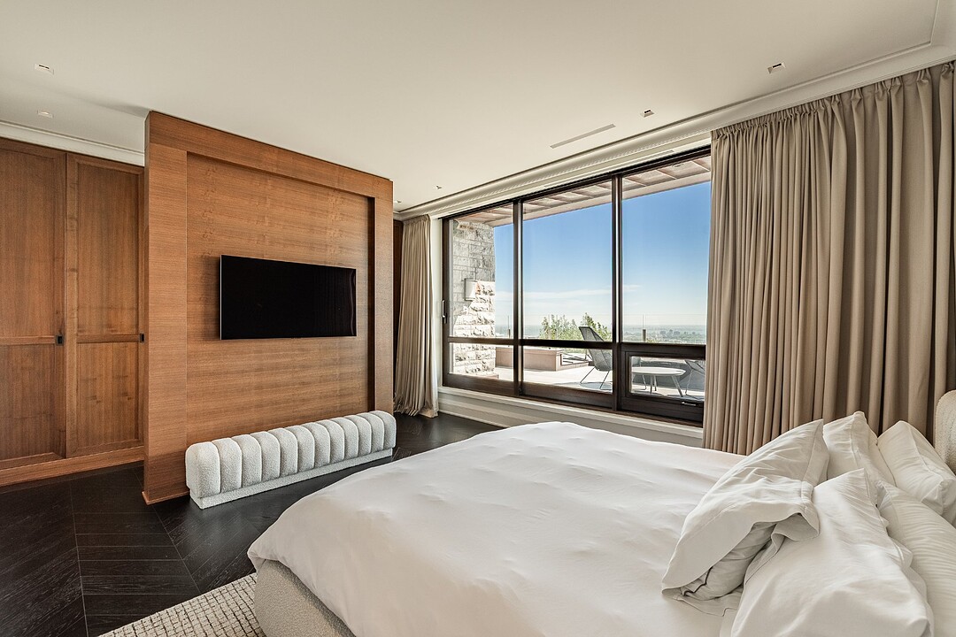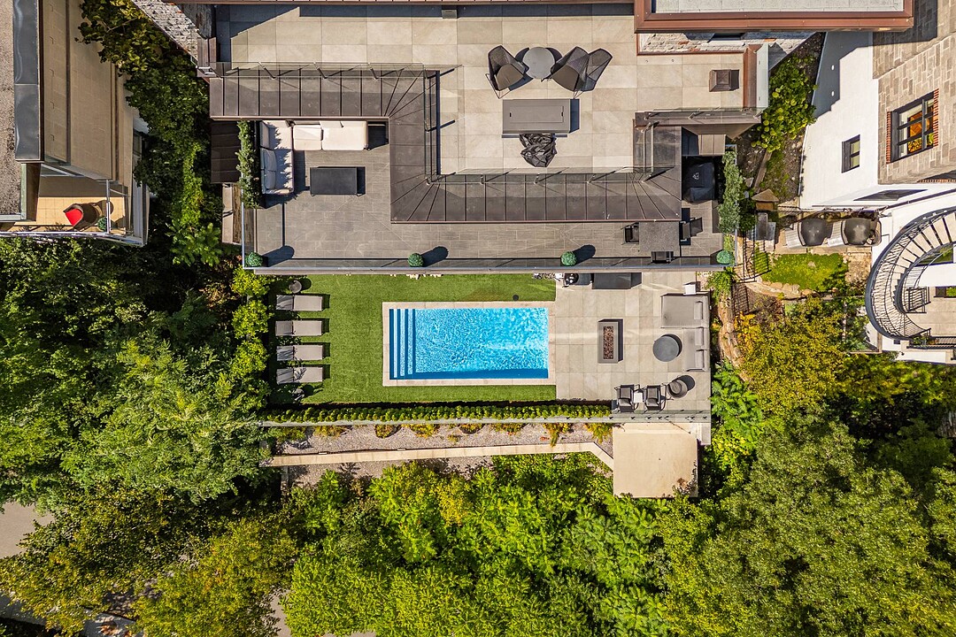 The garden level houses a playroom-gym, bedroom, bathroom with steam shower and provides access to the outdoor saltwater pool, offering the perfect blend of relaxation and fitness. Each level throughout the house offers breathtaking views of the surrounding landscape, creating a seamless connection with the outdoors.