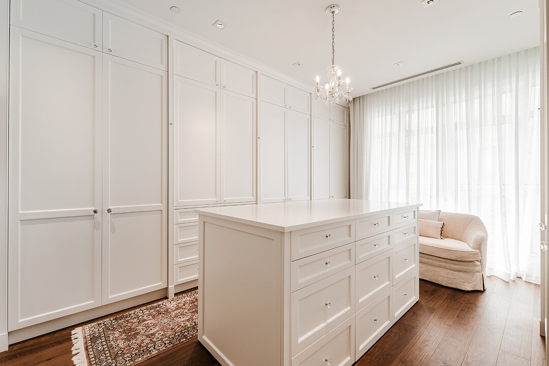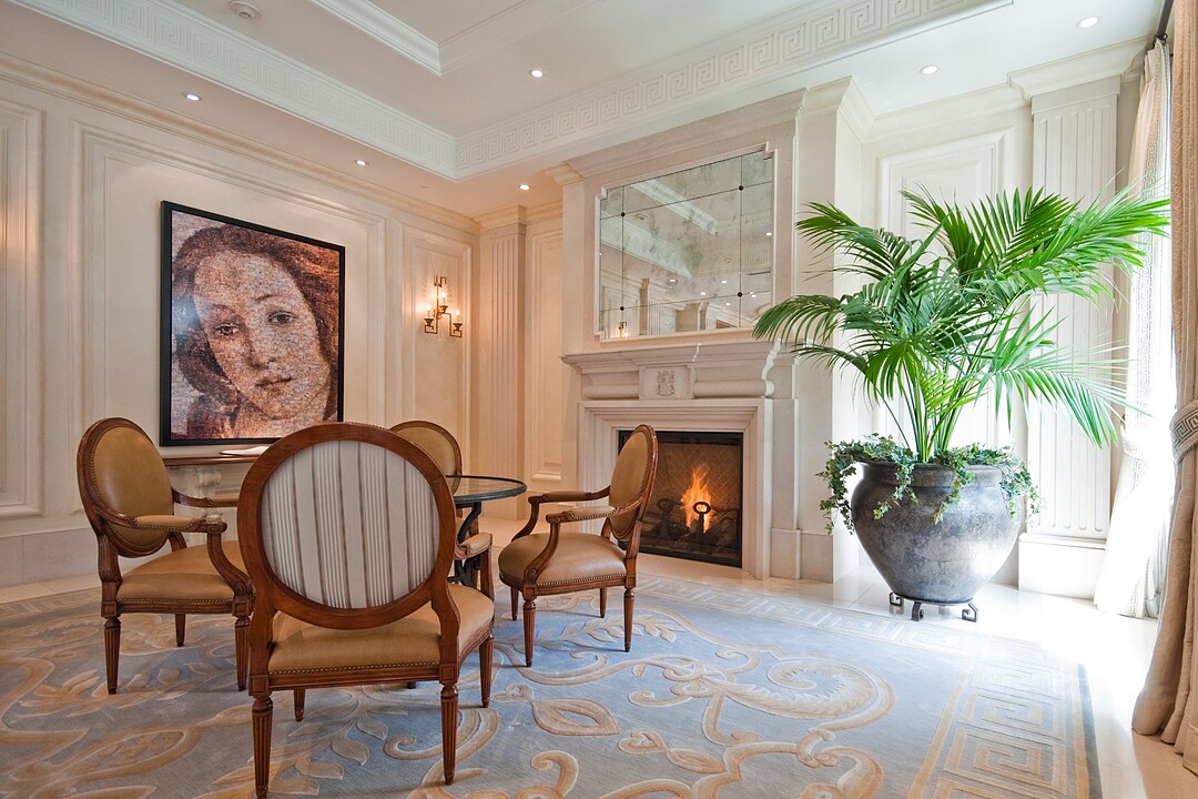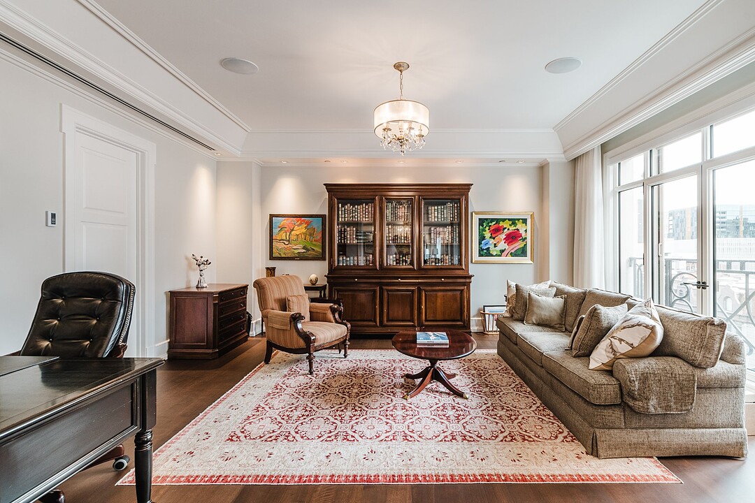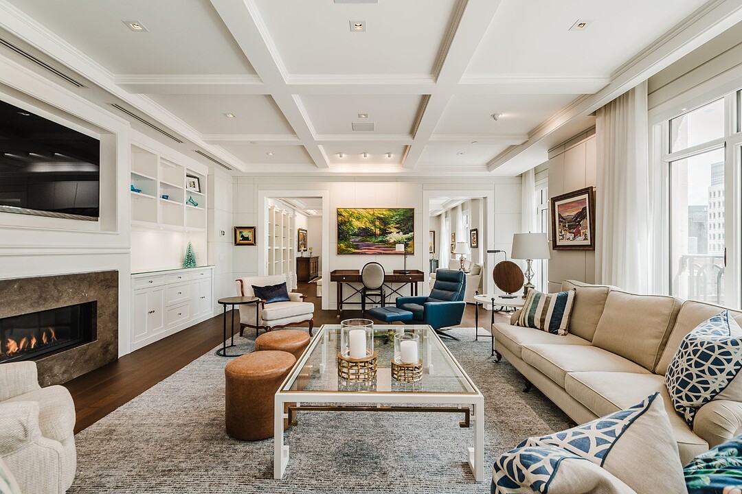 Deux chambres supplémentaires disposent chacune d'une salle de bains et d'un dressing, offrant confort et intimité à la famille ou aux invités. Le double salon orienté au sud est baigné de lumière naturelle grâce aux balcons Juliette, tandis que la salle familiale orientée au sud-ouest est dotée d'une cheminée à gaz, de plafonds à caissons, d'éléments encastrés sur mesure et d'un éclairage sur rail de qualité musée, idéal pour les collectionneurs d'art.