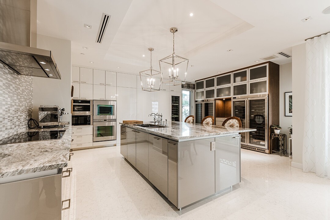 A sophisticated entry hall with coved ceilings sets the stage for the home's timeless elegance. The expansive kitchen is a chef's dream, featuring custom cabinetry, granite countertops, a generous center island, and a balcony for outdoor dining. Premium appliances include a Miele induction cooktop, Miele fridge/freezer, extra fridge and freezer drawers, Wolf microwave, dual Gaggenau ovens, and a Miele dishwasher. Wine connoisseurs will appreciate the three wine fridges--one Sub-Zero and two custom-made units--perfectly integrated into the space. Fixtures include Julien sinks and Perrin & Rowe faucets.