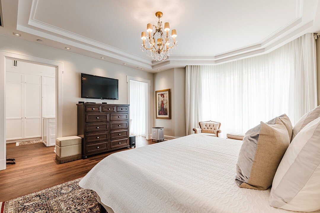 Two additional bedrooms each feature ensuite baths and walk-in closets, offering comfort and privacy for family or guests. The south-facing double living room is bathed in natural light through Juliette balconies, while the southwest-facing family room boasts a gas fireplace, coffered ceilings, custom built-ins, and museum-grade picture track lighting, ideal for art collectors.