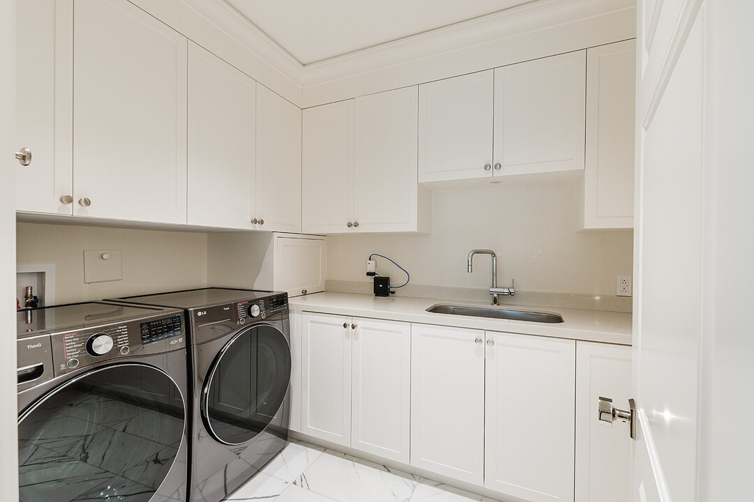 The well-appointed laundry room includes an LG washer and dryer, sink, ample storage, and a folding station. Recent upgrades include two new HVAC units (2022), a full humidification system, water filtration, and a Lutron lighting system. The garage is EV-ready with two installed electric car chargers.