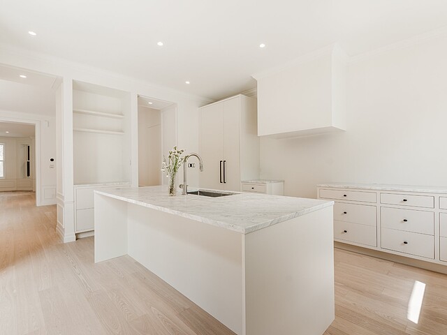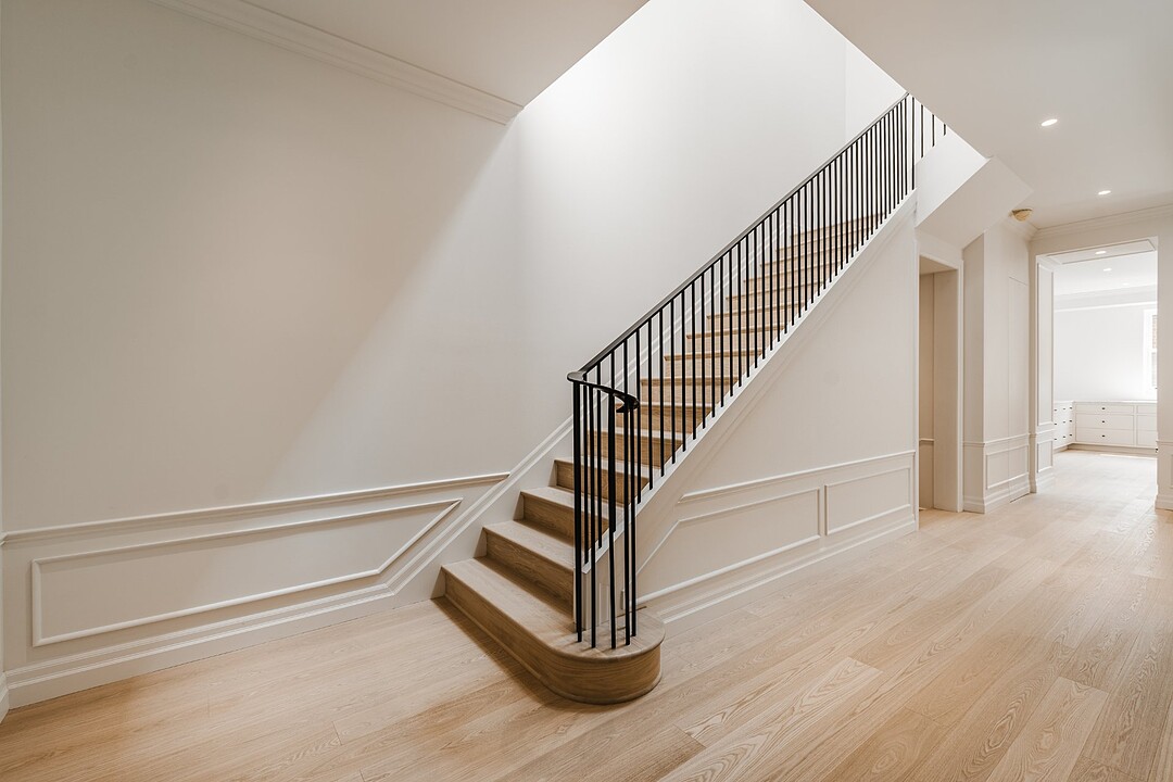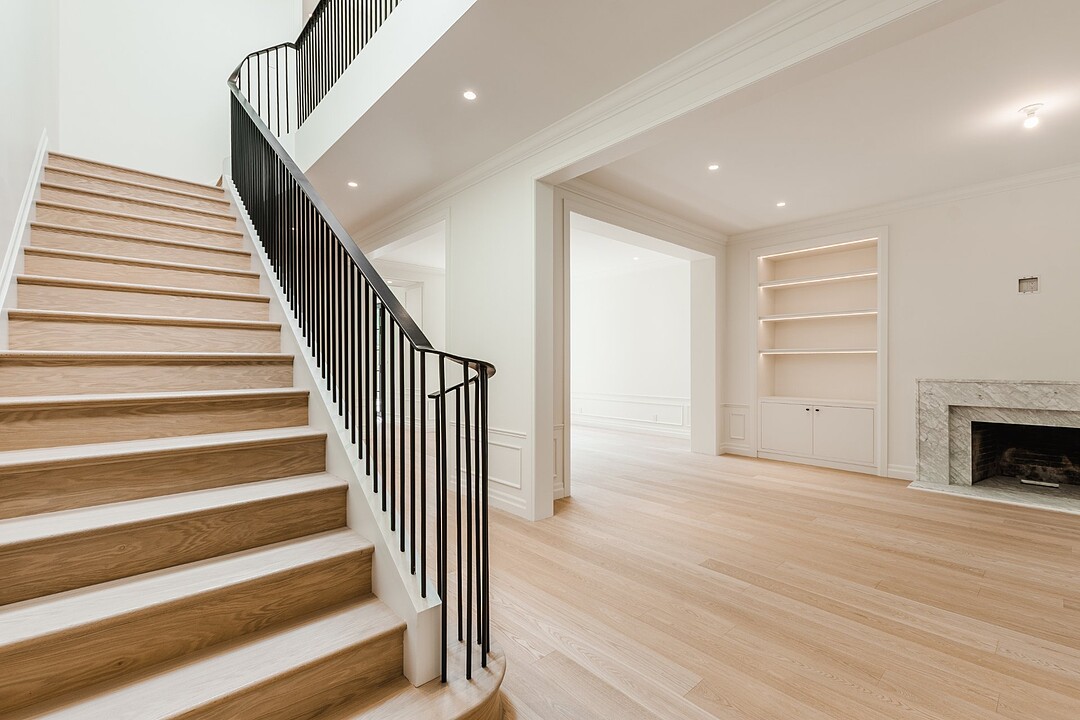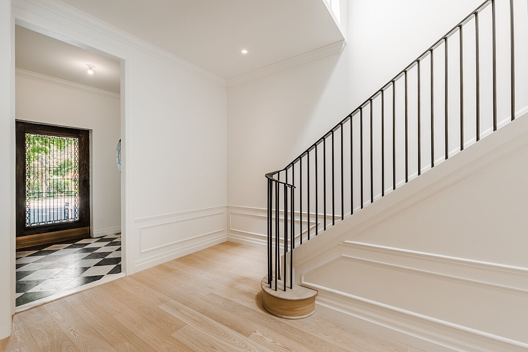 The ground floor is flooded with natural light thanks to oversized windows and an open, flowing layout. A sophisticated vestibule with checkerboard marble flooring, a built-in closet with integrated bench sets a warm, polished tone.