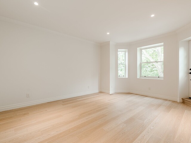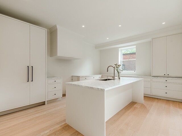 Upstairs, the spacious primary suite enjoys leafy park views and access to a private balcony. The ensuite bathroom is a true retreat, with a sculptural soaker tub, double vanity, walk-in shower, and a skylight that fills the space with natural light. An adjacent room can be customized as a large walk-in closet, nursery, office, or additional bedroom.