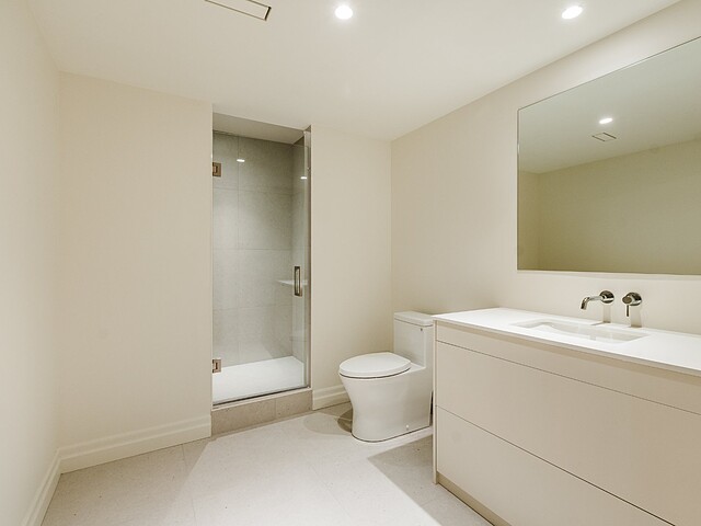 A stylish powder room with a custom marble vanity completes this floor.