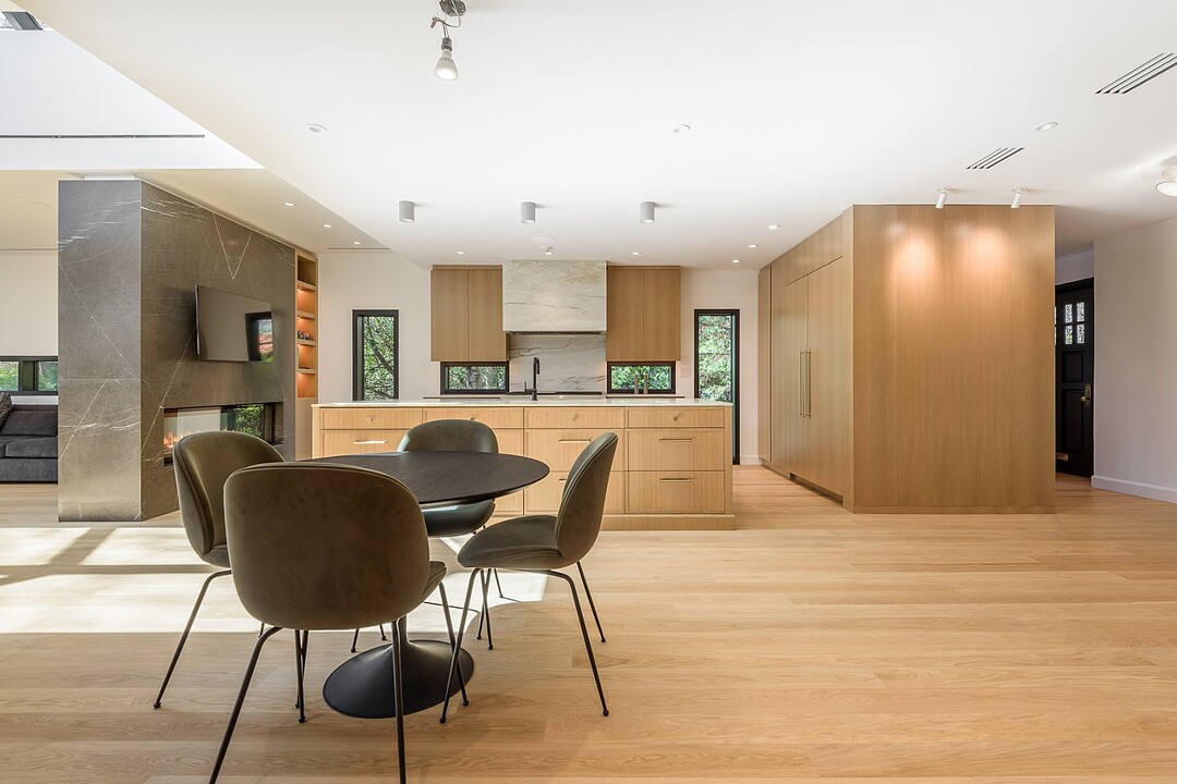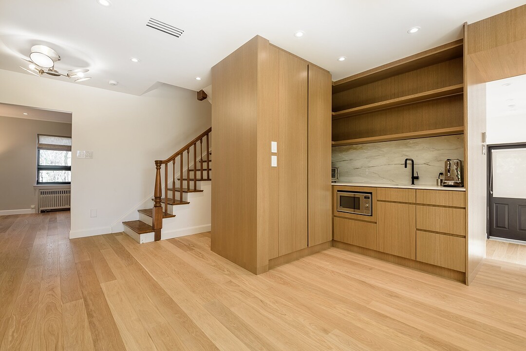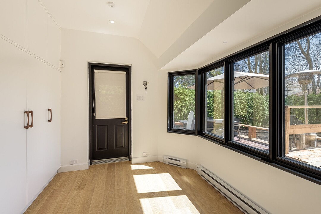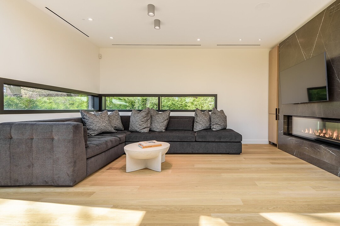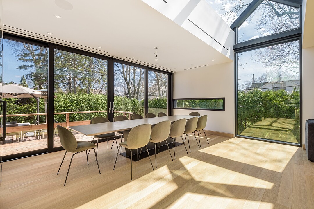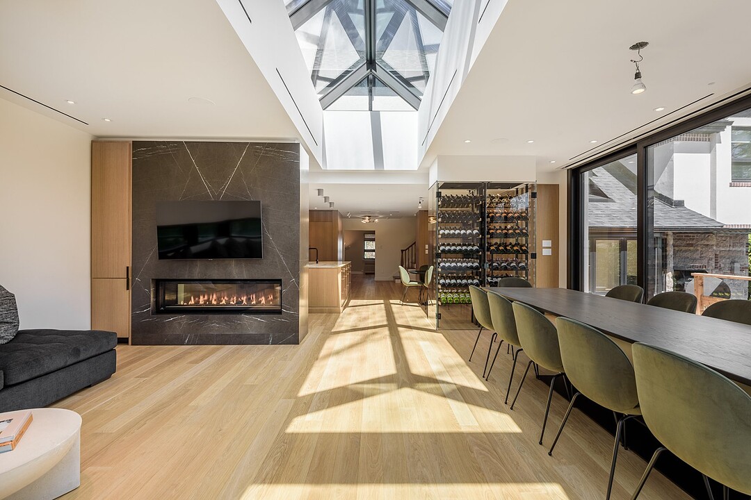 The large light filled dining room/living room area is perfect for intimate dinners or large family events and features double height fenestration with curtain wall glass doors offering garden access. The modern living room features a beautiful contemporary gas fireplace. Another living room or office can be found along the front of the house. Off the kitchen is also a large butlers pantry with another access to the garden. A large mudroom and powder can be found just off the garage which is also conveniently ground level.