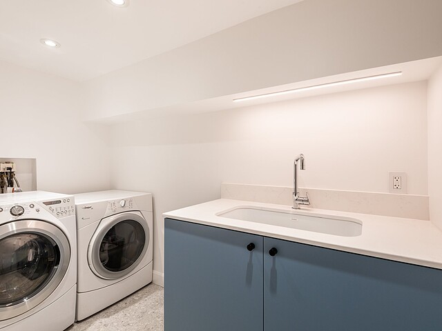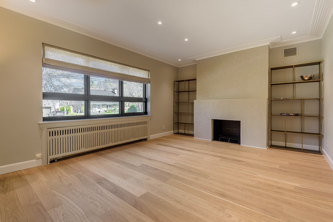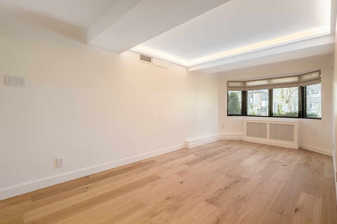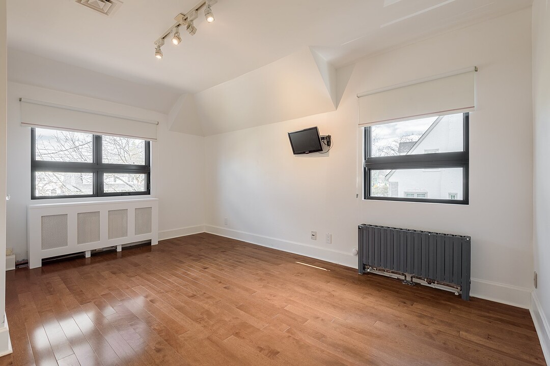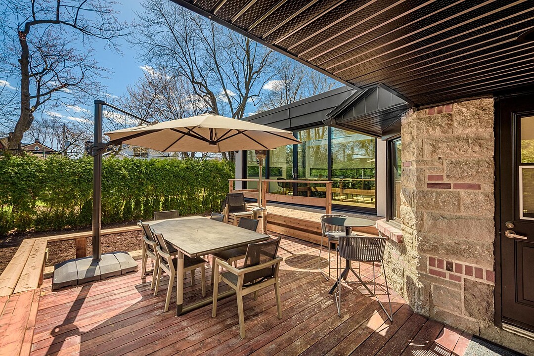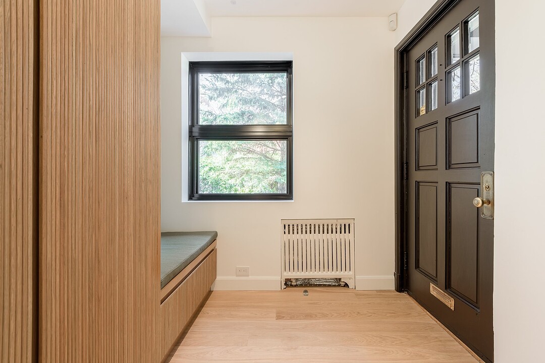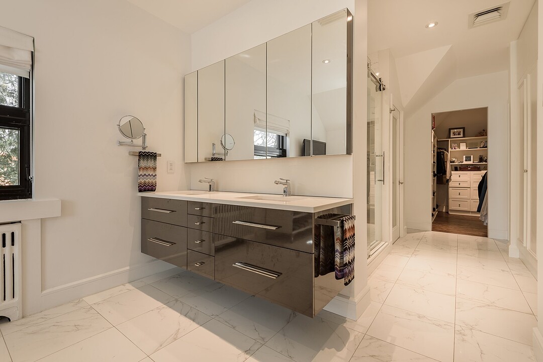 The large light filled dining room/living room area is perfect for intimate dinners or large family events and features double height fenestration with curtain wall glass doors offering garden access. The modern living room features a beautiful contemporary gas fireplace. Another living room or office can be found along the front of the house. Off the kitchen is also a large butlers pantry with another access to the garden. A large mudroom and powder can be found just off the garage which is also conveniently ground level.