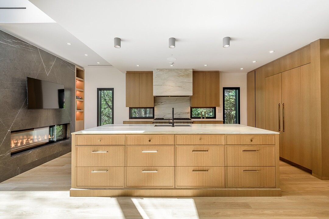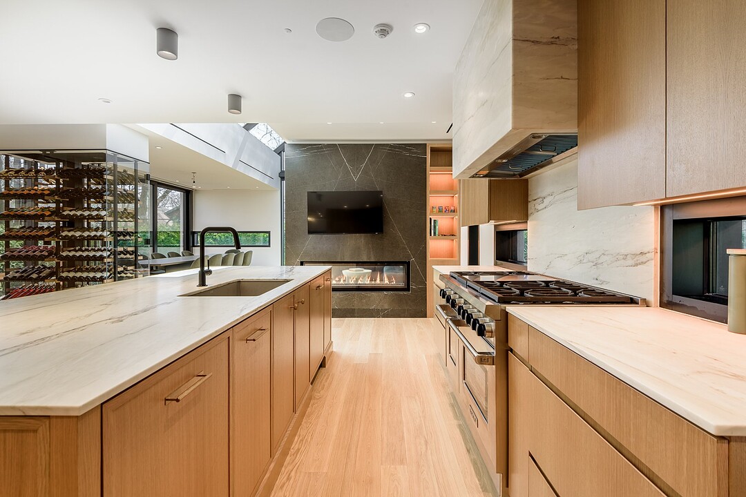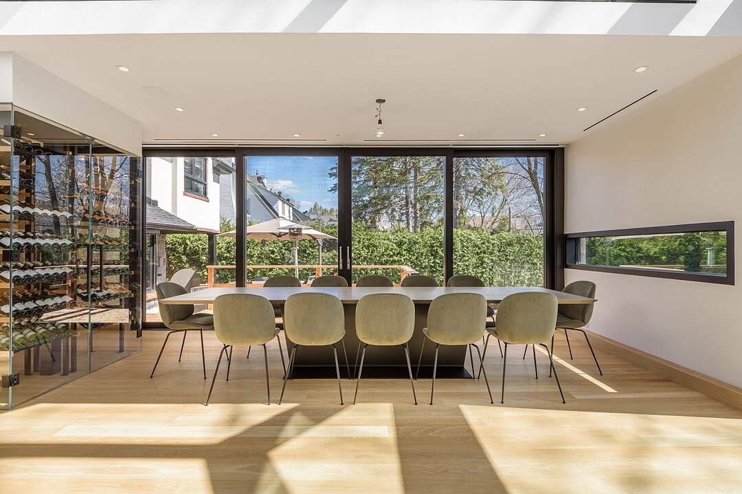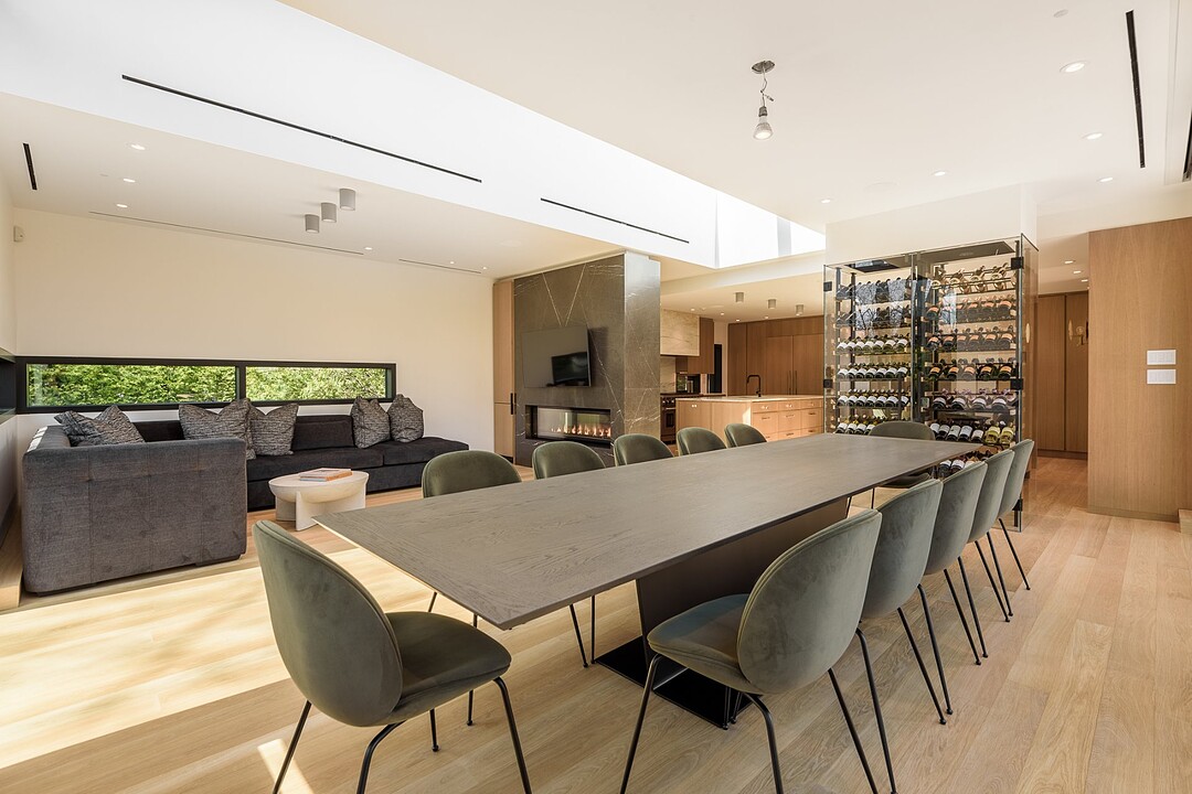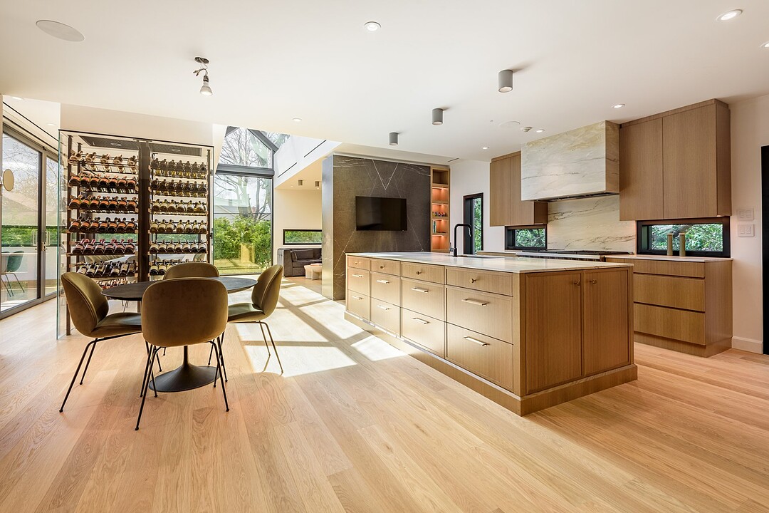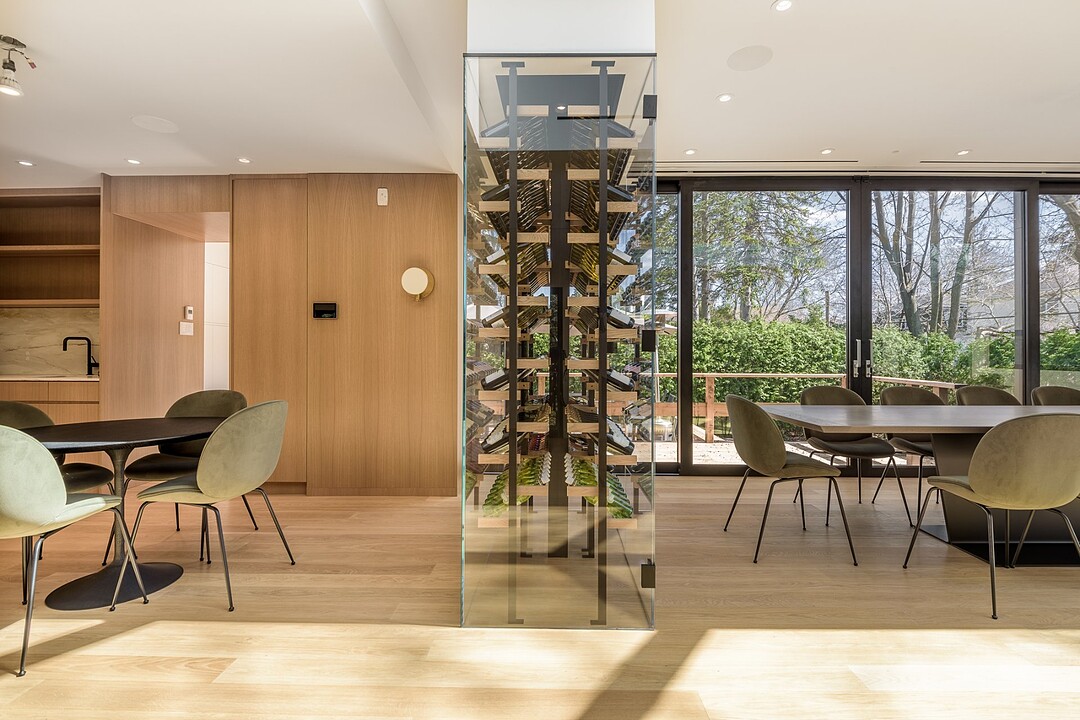 Continue readingThe main living area has floor to ceiling walls of glass that look onto lush greenery. The kitchen is a gourmet chef's dream. Perfect for entertaining and family living, it features sleek cabinetry, a large island, top of the line appliances (Wolfe gas stove/oven, Miele dishwasher, Subzero fridge/freezer, large full length wine cellar) and plenty of storage and a lovely breakfast area. A beautiful glass cased wine cellar which can hold 196 bottles brilliantly separates the kitchen eating area and the dining room.
