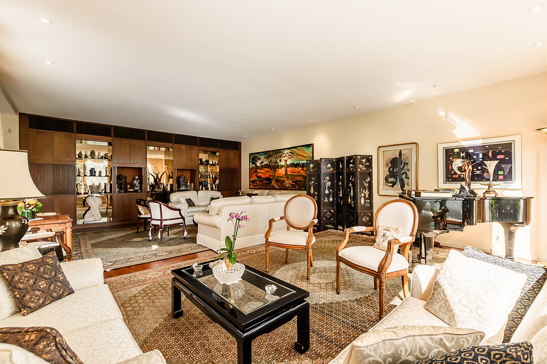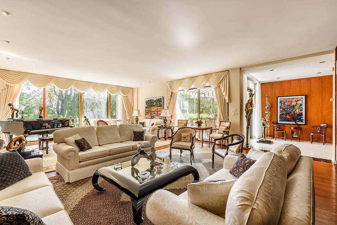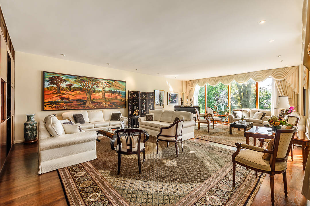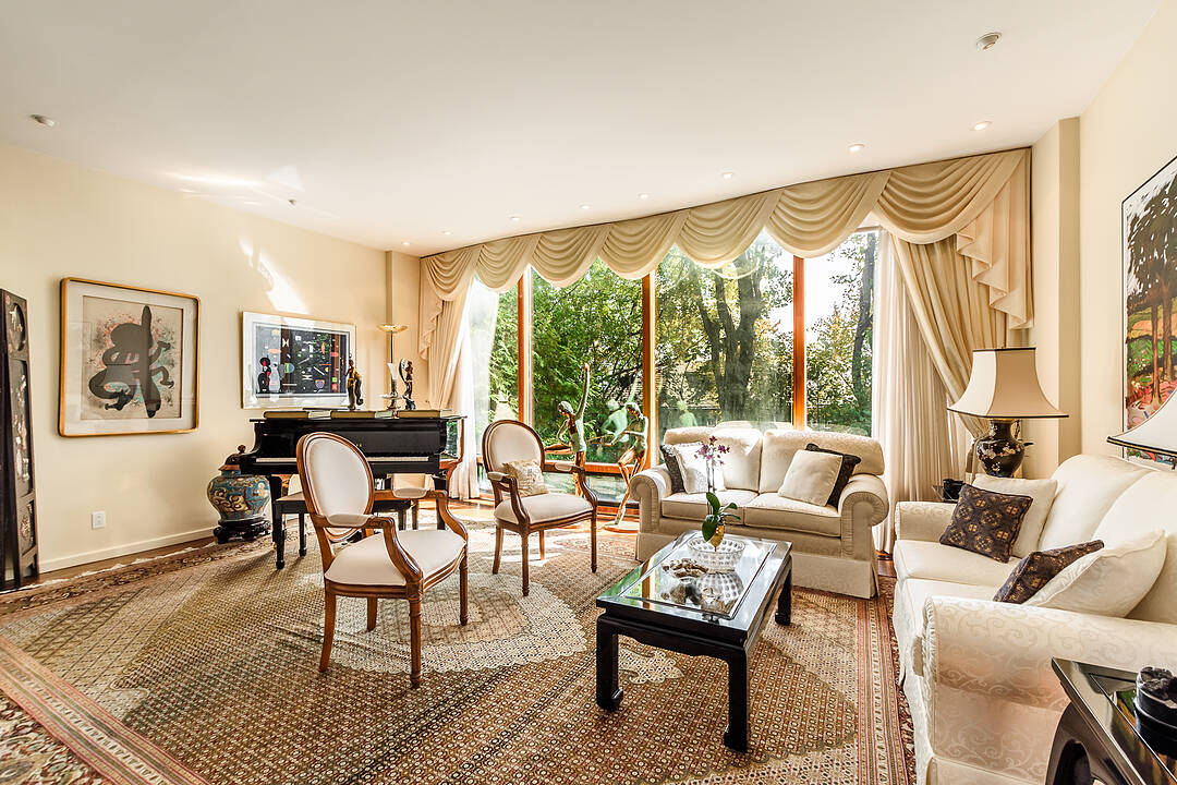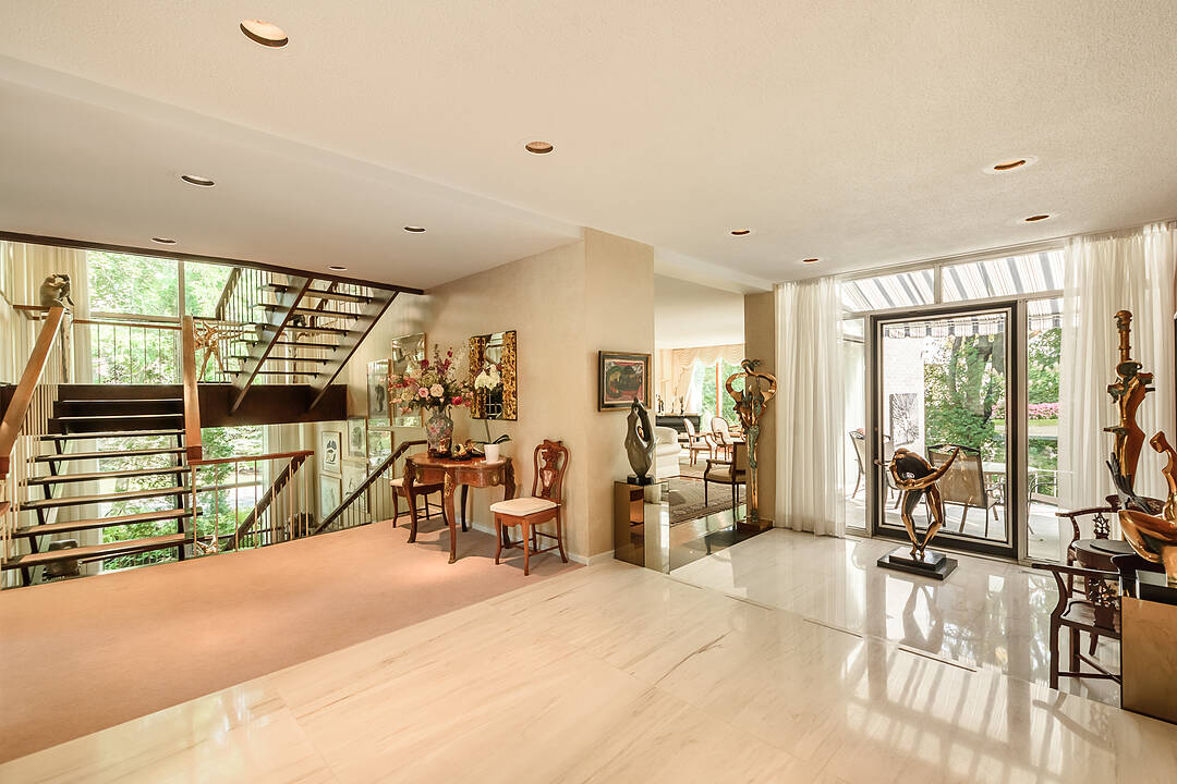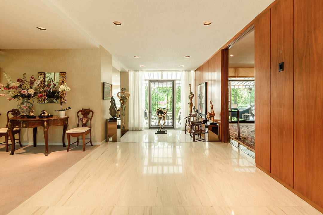 Grand Entrance & Timeless Elegance As you step through the grand entrance hall with its opulent marble floors, you'll be greeted by wood-paneled walls that exude warmth and timeless charm. Floor-to-ceiling curtain wall windows and glass doors seamlessly connect the interior to the picturesque garden, offering an abundance of natural light and creating a seamless indoor-outdoor experience.