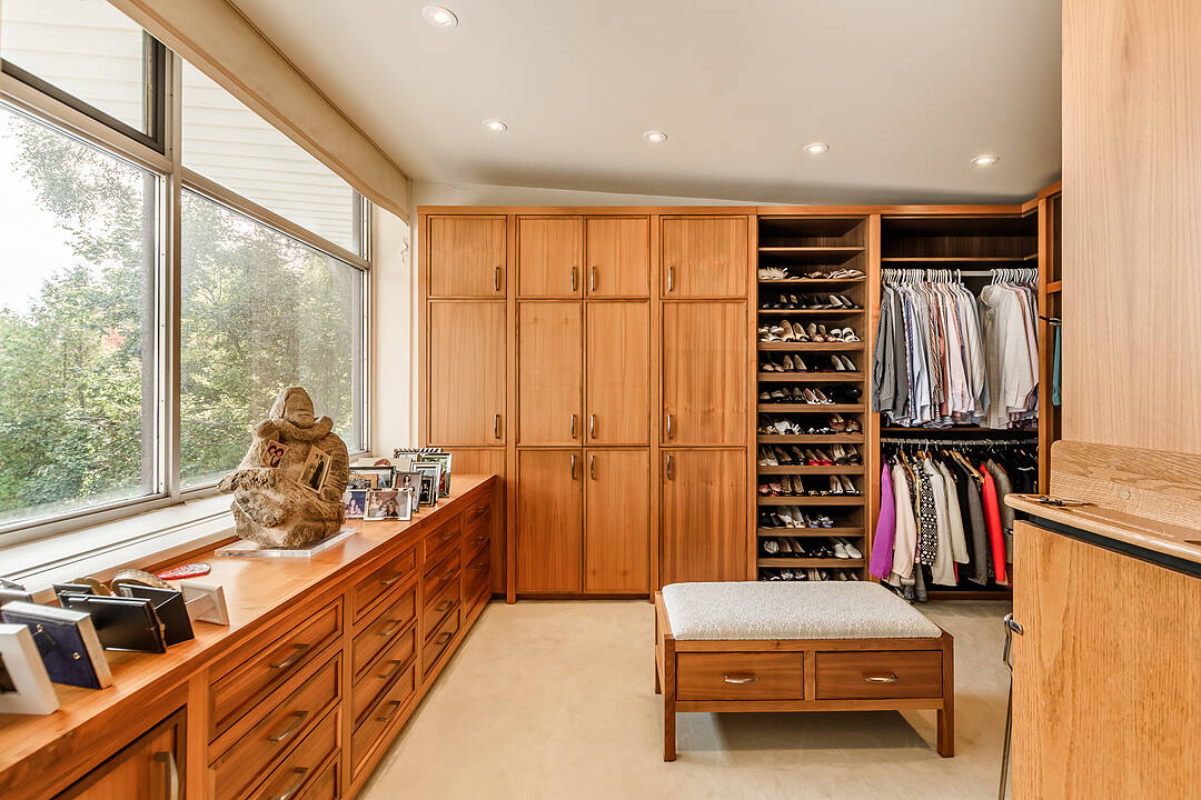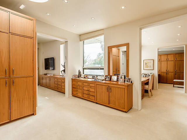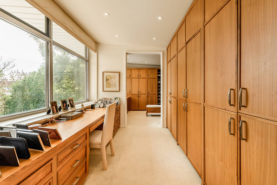 Luxurious Upstairs Retreat Ascending the elegant staircase to the upper level, you'll find a generously proportioned landing that epitomizes luxury living. The principal suite is a sanctuary of its own, featuring cathedral ceilings, multiple skylights, and large windows overlooking the lush garden. His and her bathrooms and a vast walk-in closet with a desk area complete this haven of comfort. Across from the principal bedroom, an upstairs den/office with a fireplace offers a private escape.