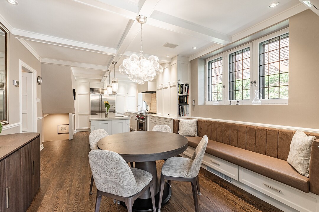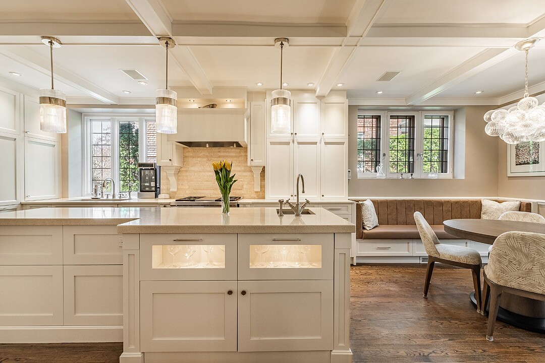 Continue readingAs you step inside, you are greeted by a grand formal living room, where a cozy gas fireplace and rich architectural details create an inviting ambiance perfect for entertaining or unwinding after a long day. The heart of the home, the chef's kitchen, is a culinary masterpiece featuring coffered ceilings, high-end appliances, and a generous center island. The adjacent breakfast nook, with its built-in banquette, invites casual morning gatherings, while the seamless flow from the kitchen to the private patio enhances your outdoor dining experience.