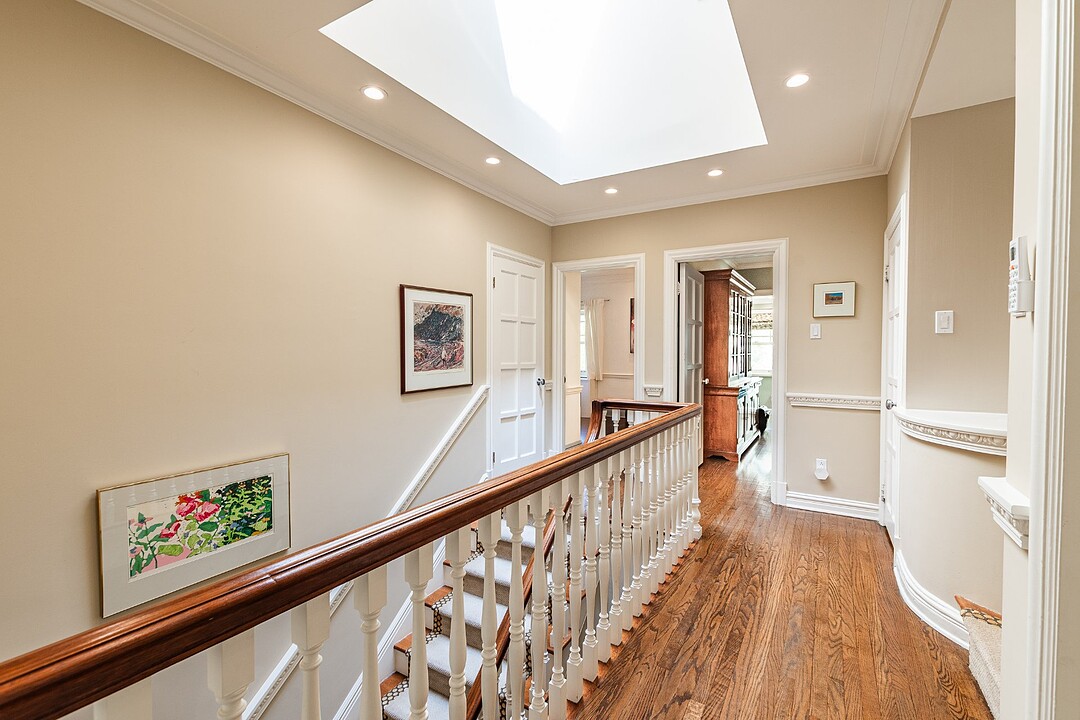 The second floor is a sanctuary of elegance, highlighted by an oversized skylight that bathes the staircase in natural light. The expansive primary suite is a true retreat, complete with a unique fireplace, a lavish en-suite bathroom featuring dual sinks, a soaking tub, and a separate glass shower, along with a spacious walk-in closet. This floor also houses two additional bedrooms, including a cozy den with its own fireplace and a bright office space.