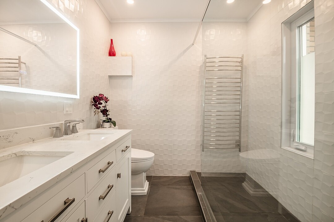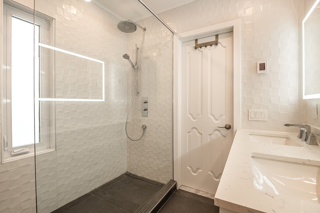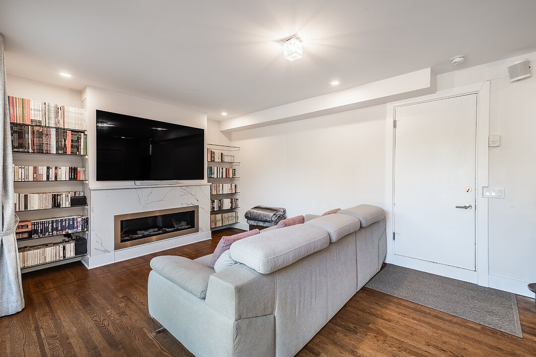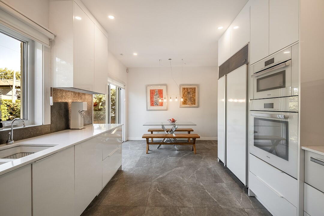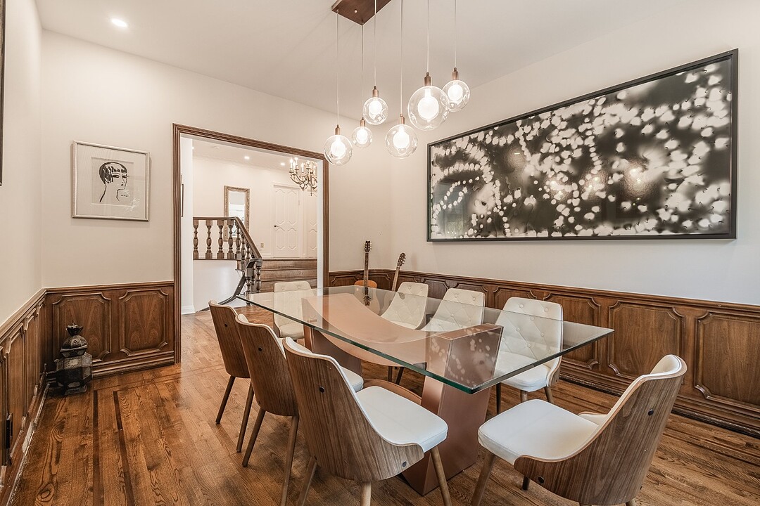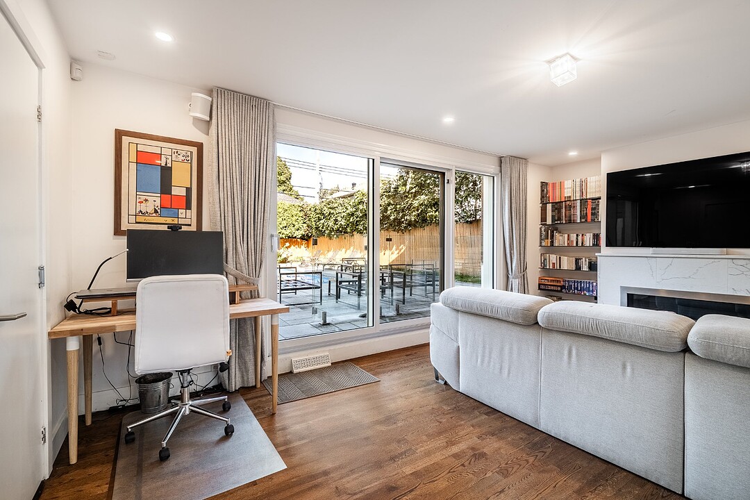 À quelques marches seulement du niveau principal se trouve une spacieuse salle de séjour/salle familiale donnant sur la piscine et le jardin; un espace accueillant pour se détendre ou pour recevoir. Ce niveau comprend également un accès direct au grand garage intégré pour deux voitures. Le sous-sol entièrement aménagé offre un espace de vie encore plus flexible. Il comprend une chambre d'amis, une salle de bain contemporaine, un bureau, une cave à vin et une grande salle familiale à aire ouverte qui peut facilement servir de salle de jeux, de gym ou de salle de séjour supplémentaire.