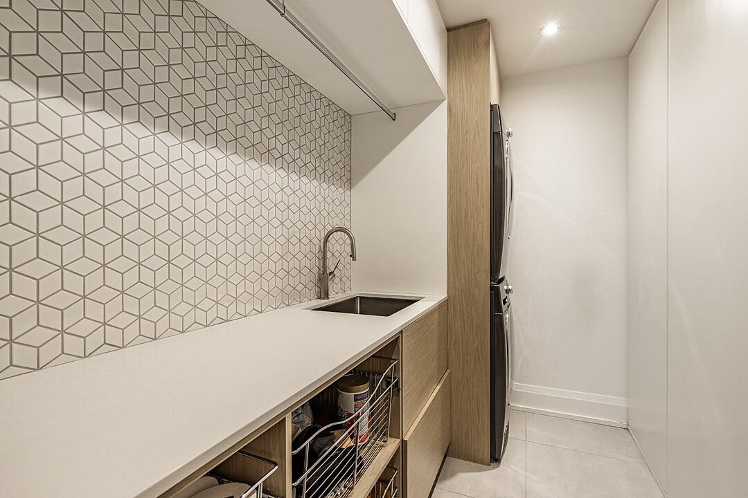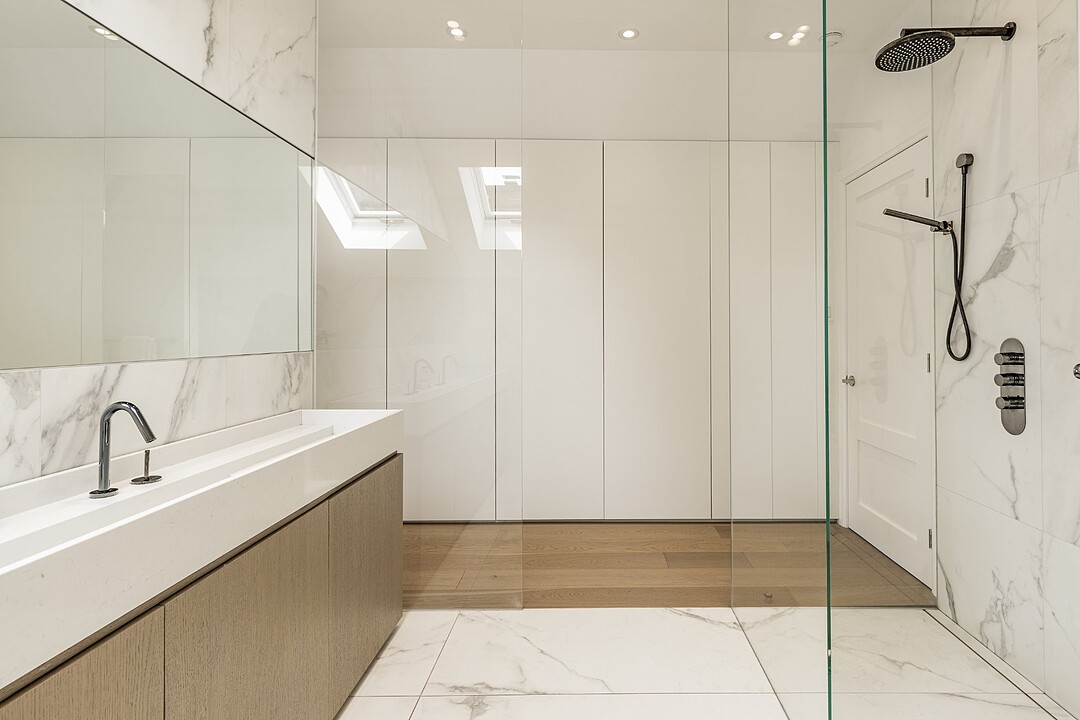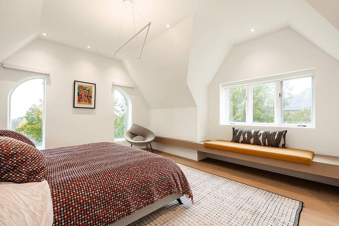À l'étage, la maison offre deux lumineuses chambres d'enfants avec des meubles intégrés faits sur mesure et une grande salle de bain familiale. La suite principale réaménagée comprend une luxueuse salle de bain attenante et de nombreux placards intégrés faits sur mesure.