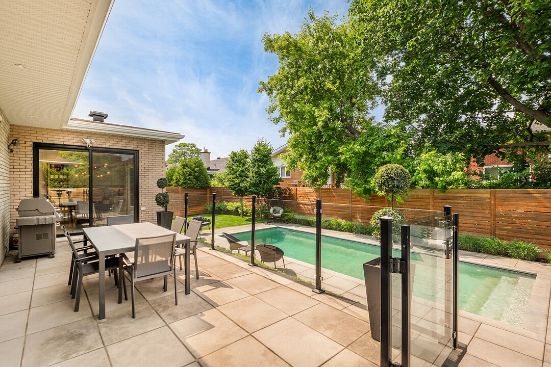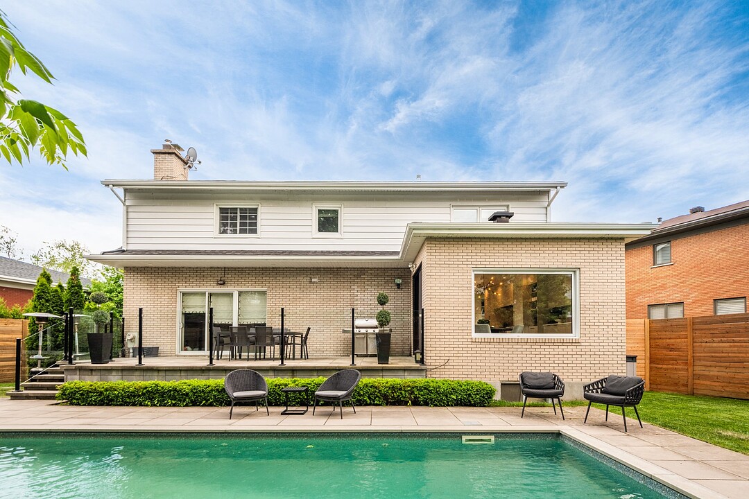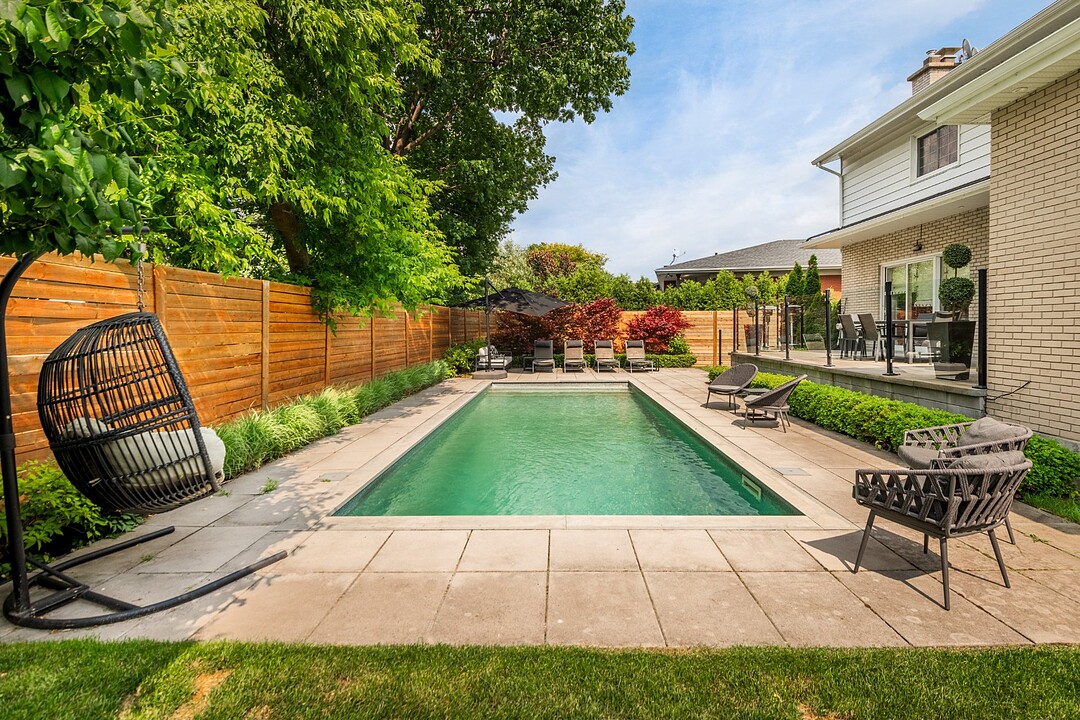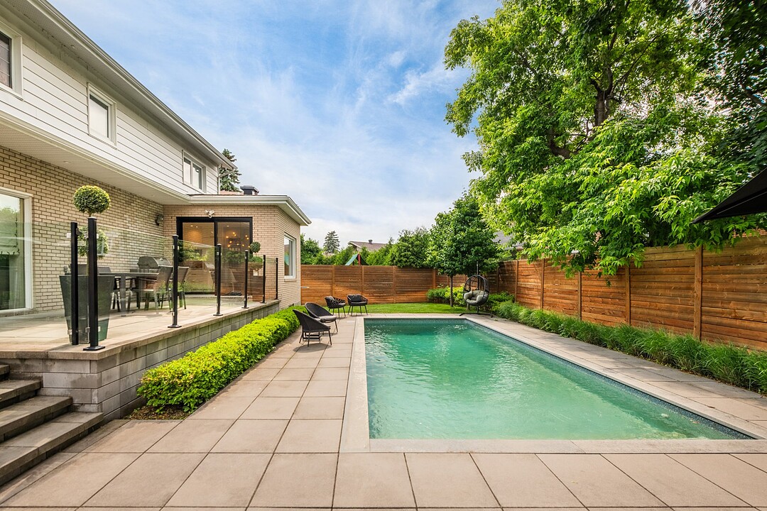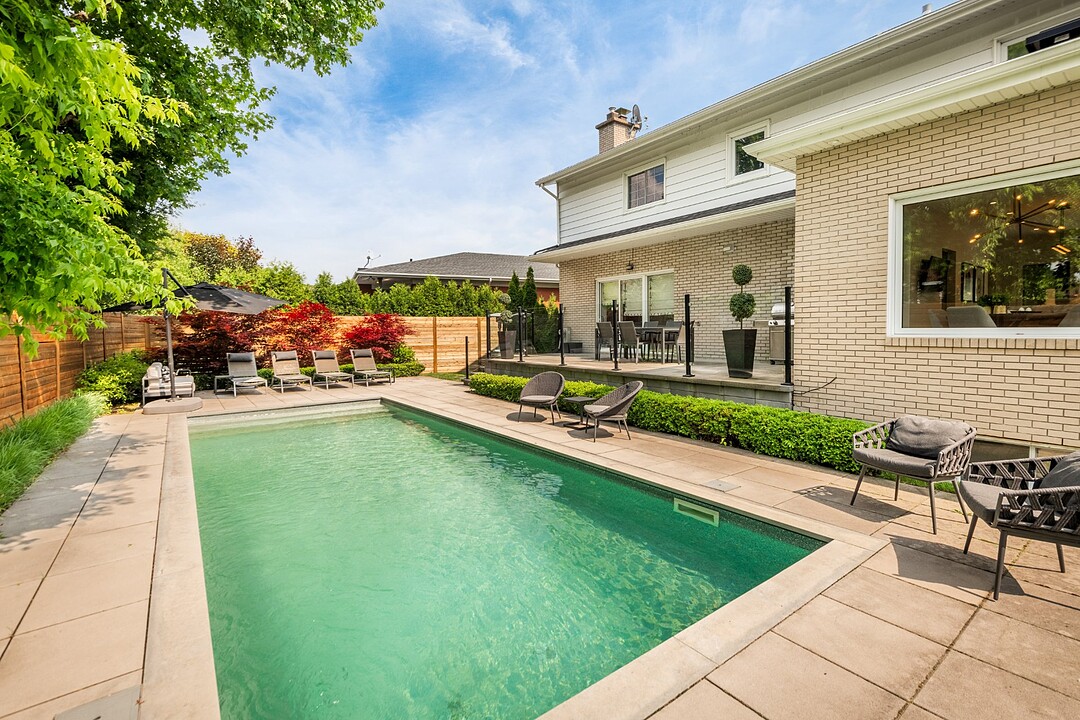 La cour arrière est une oasis privée, avec une superbe piscine, un grand espace pour s'asseoir, une terrasse et un espace vert luxuriant - parfait pour profiter de la vie à l'extérieur et pour recevoir.