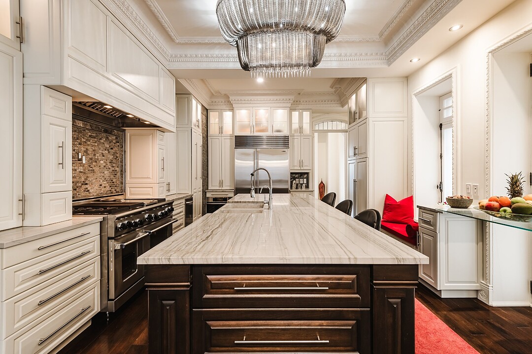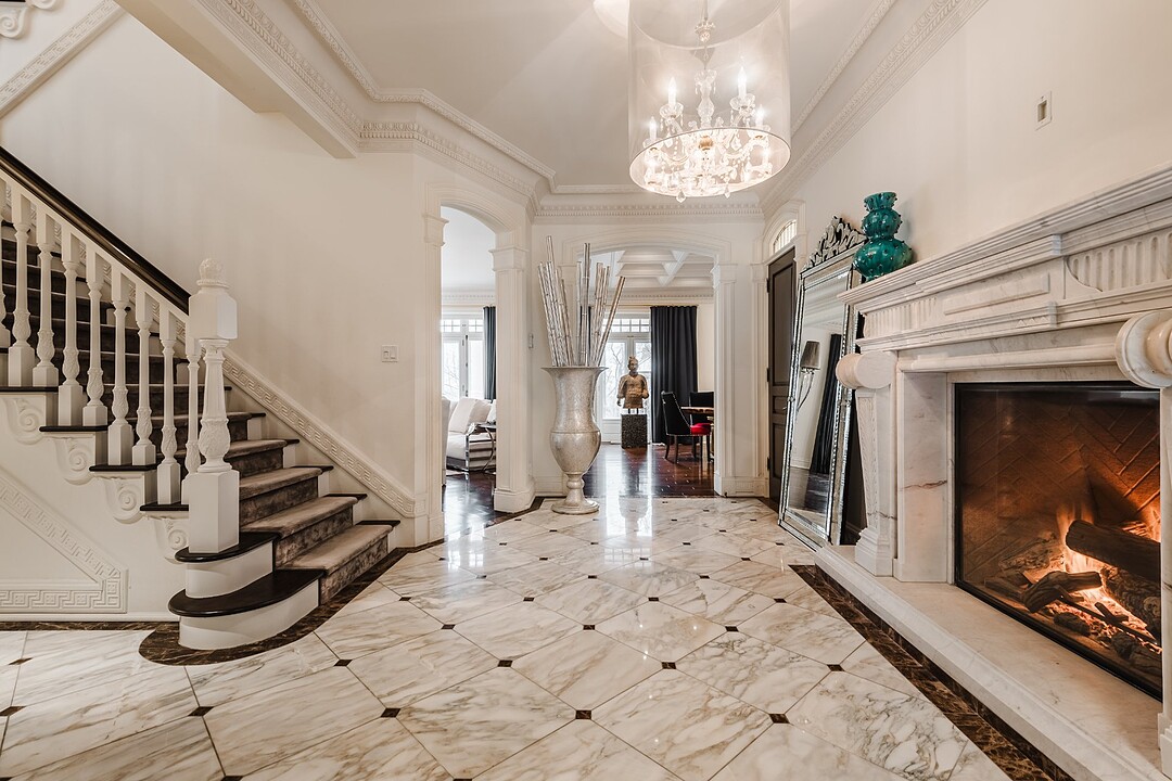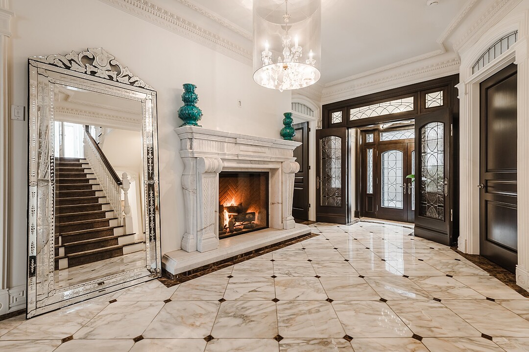 *Rez-de-chaussée* Un vestibule mène au hall central revêtue de marbre, avec l'immense cheminée aussi en marbre donnant le ton pour le reste de cette grande demeure. Surplombant la vaste galerie arrière avec ses imposantes colonnes doriques de 20 pieds de haut, se trouve la pièce principale : une salle à manger avec une cheminée pouvant accueillir des dizaines d'invités, un superbe salon et une salle de séjour vitrée avec une autre cheminée, le tout avec de grandes portes créant une connexion naturelle et facile avec la zone extérieure impressionnante à l'arrière. La cuisine du chef, revêtue de bois, de marbre et d'appareils électroménagers de première qualité, comporte une élégante salle à manger vers l'avant. Un grand bureau et une salle d'eau près de l'entrée principale complètent cet étage.
