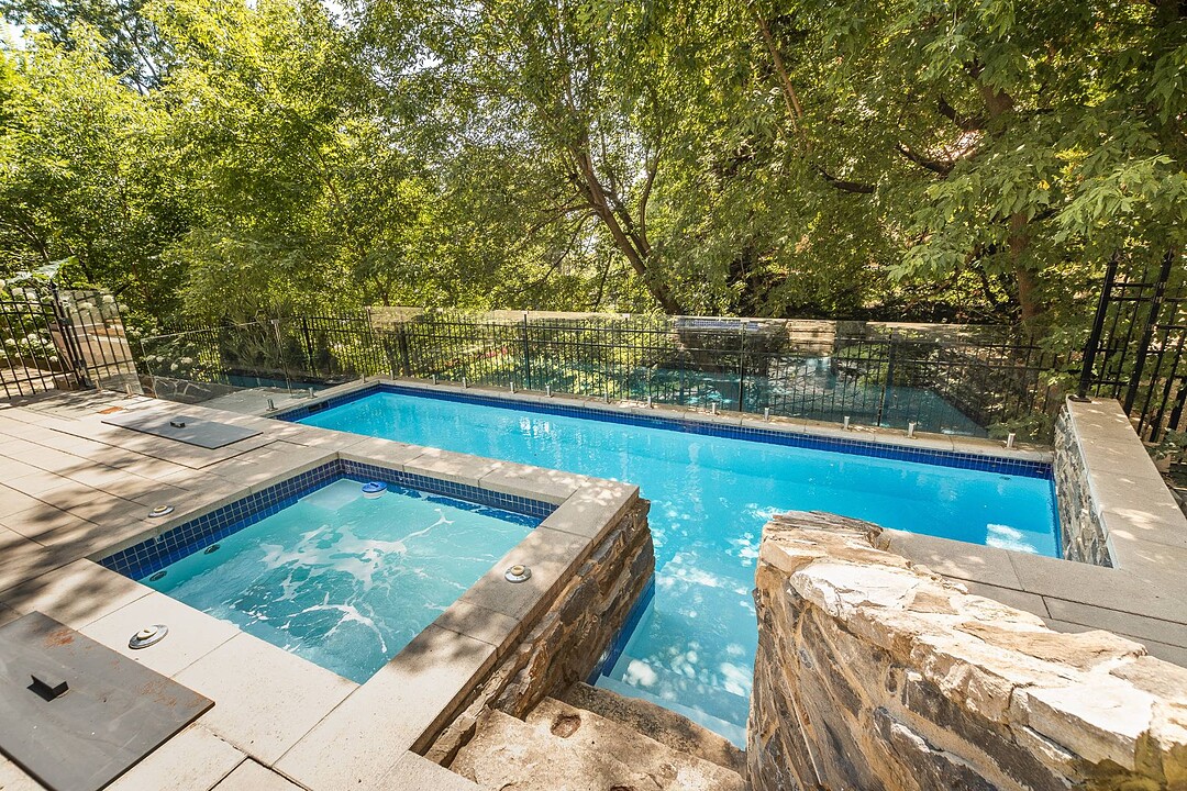 *Extérieurs* La galerie principale présente des plafonds de 20 pieds et s'étend sur la largeur de la résidence, offrant à la fois des espaces assis et des espaces repas. Elle surplombe le jardin privé et la piscine. Avec l'ajout de la magnifique piscine d'eau salée récemment construite, adossée à des murs de pierre et à un grand patio paysager, ce niveau offre un espace immense pour toute la famille.