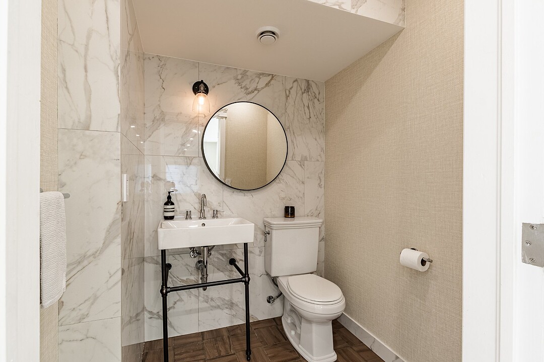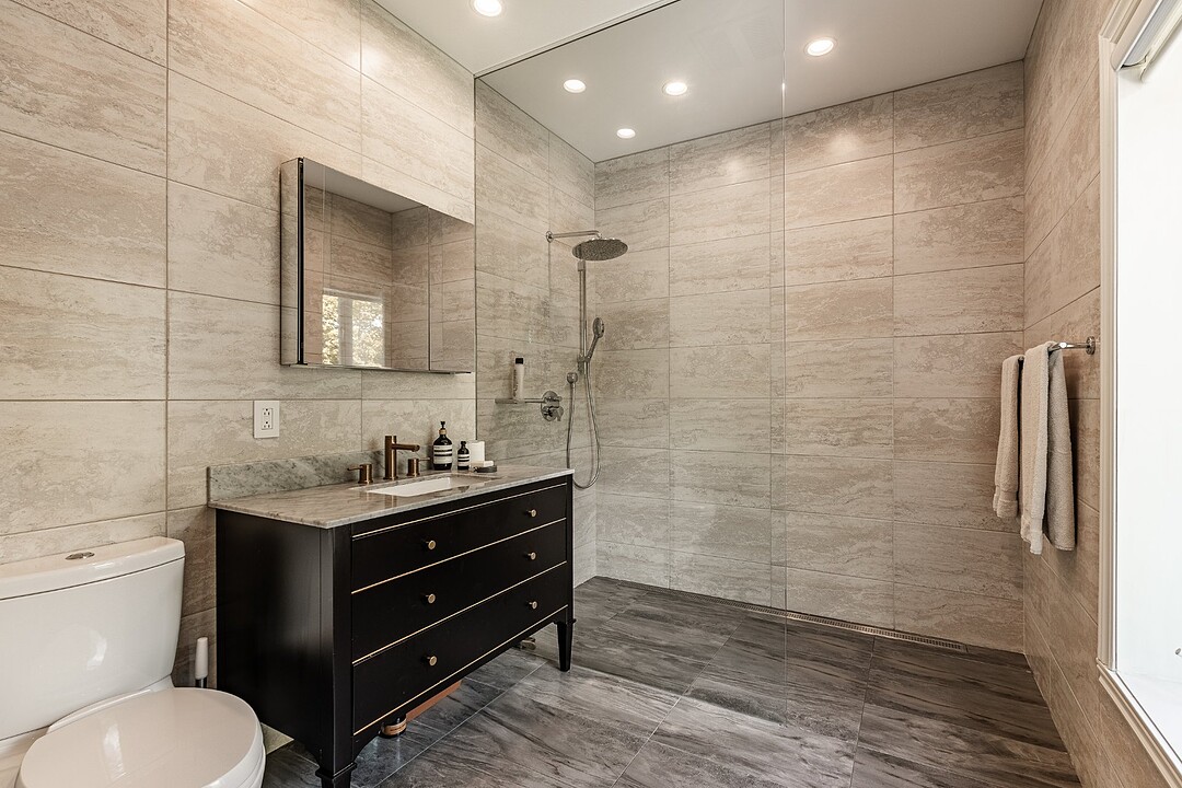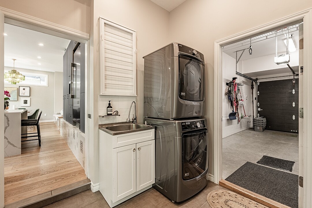 Une élégante salle d'eau complète le niveau principal. Juste à côté de la cuisine, un vestiaire comprend du rangement intégré, une laveuse et une sécheuse, ainsi qu'un accès au jardin - un point d'entrée idéal depuis le garage intégré.